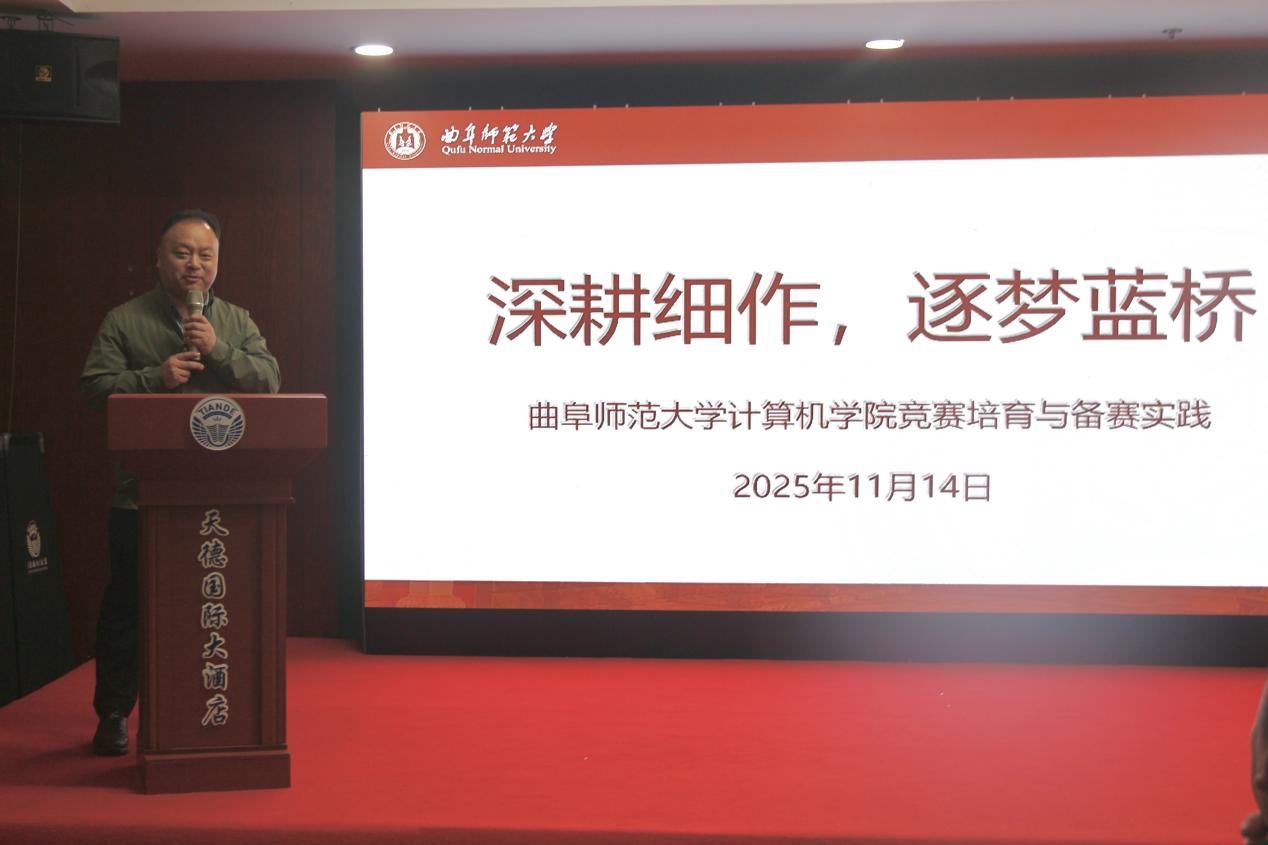 院长李光顺为会议致辞,代表曲阜师范大学对参会嘉宾表示欢迎和感谢,他在致辞中强调了赛教融合在新时代人才培养中的核心价值,提出以赛事为纽带激活教育教学全链条的发展思路,为本次交流会锚定了“务实创新、协同共进”的交流方向。