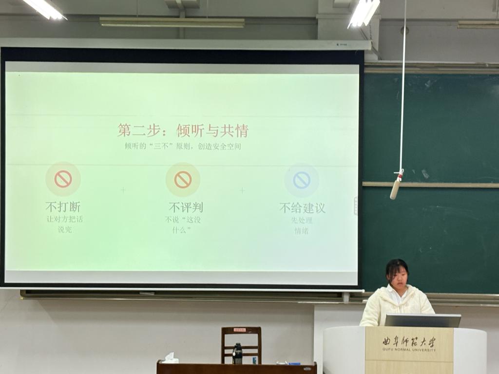 心理健康服务部主讲人结合大学生心理特点,细致讲解情绪异常的各类信号;随后通过模拟“宿舍矛盾调解”“学业压力疏导”等真实场景,生动演示“非评判式倾听”的要点与共情表达的技巧,引导学员以包容态度搭建信任桥梁,为身边同学提供专业且温暖的心理支持。