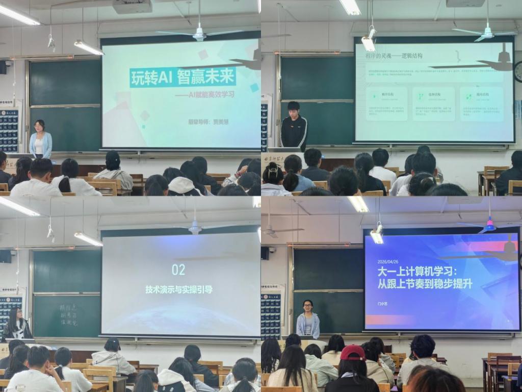 李庆征系统温习了C语言的顺序、选择、循环三大逻辑结构;而后董嘉慧以“飞天圆梦”为主题,结合航天元素讲解海报设计的构图与色彩搭配;贾美慧聚焦AI高效学习,分享提示词黄金法则及学术提效避坑技巧;门小艺围绕大一计算机专业学习痛点,分享夯实基础与稳步提升的实用方法;李梦乐则讲解了Word与Excel的核心功能及数据处理实操技巧。